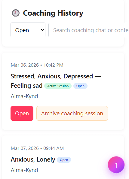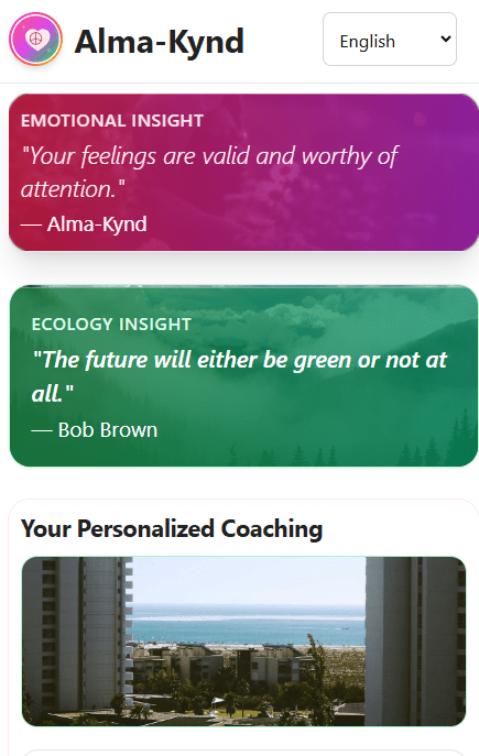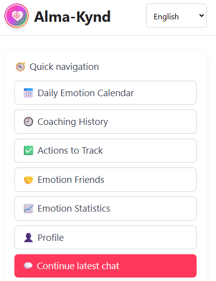 Alma-Kynd personalizes coaching using your previous discussions, your emotional patterns over time, and your profile details like city, preferred language, and Coaching Preferences / Interests.