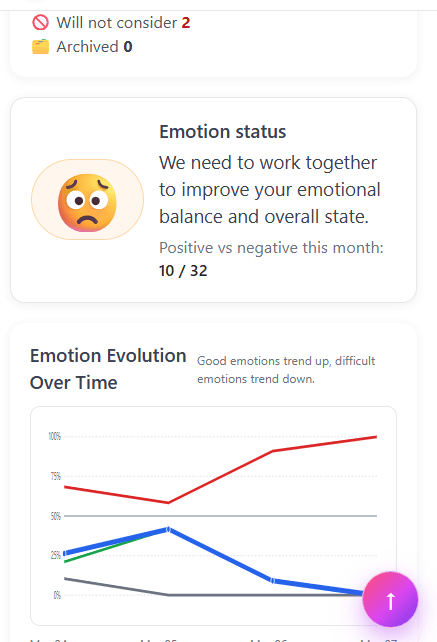- Provides AI coaching with interpretation, concrete action, and daily mantra.