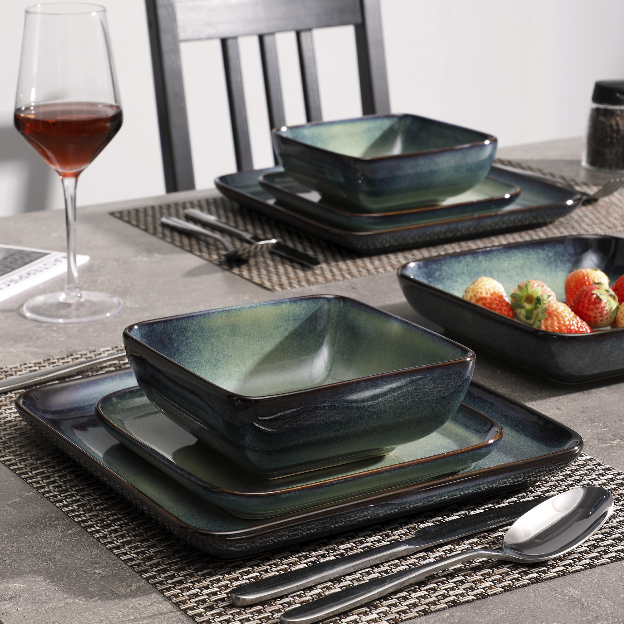 16 Piece Dinner Set Green Square Kiln Change Glaze Tableware Kitchen Dinnerware Ceramic Crockery Set for 4 Person