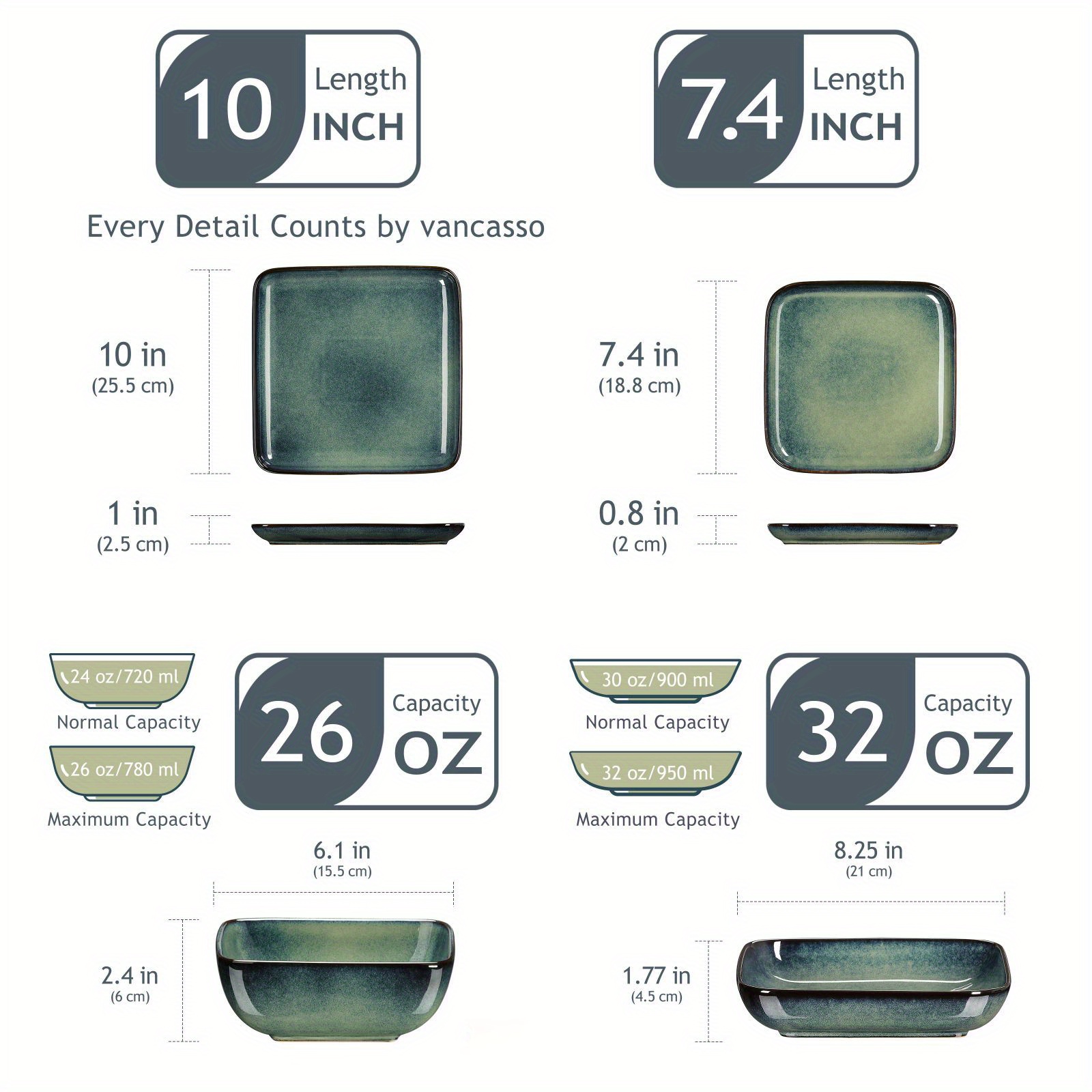 Set includes: 4 dinner plates measuring 10 inches in diameter and 2.5 cm in height, 4 dessert plates measuring 7.4 inches in diameter and 2 cm in height, 4 cereal bowls with a capacity of 780ml measuring 15.5 cm in diameter and 6 cm in height, and 4 soup plates with a capacity of 950ml measuring 21 cm in diameter and 4.5 cm in height.