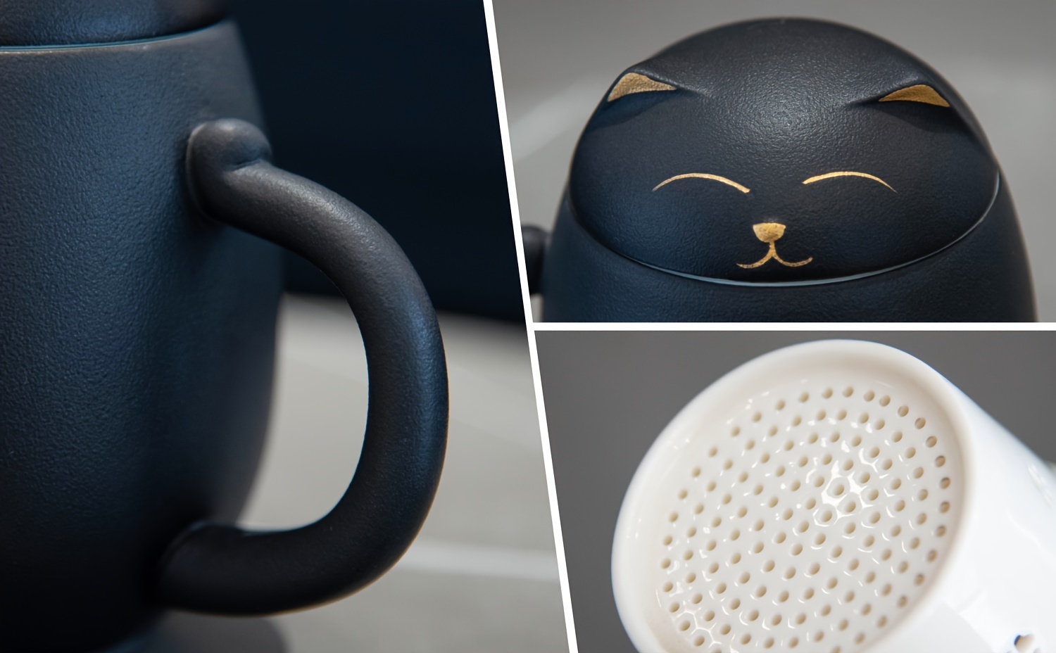 2.Cute Cat: The cute cat shape and the handle is the tail of a cat, which means it is scald-proof and smooth to hold. The lid is designed to keep your tea hot while steeping and can be used as a tray for the infuser to catch drips.
