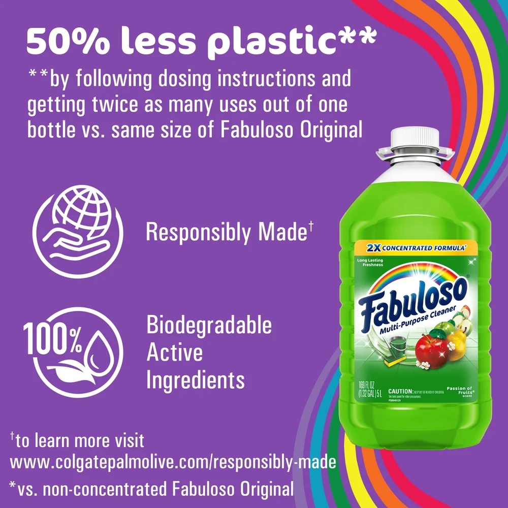 2x Multi-Purpose Cleaner is the perfect solution for anyone looking for an effective way to keep their home clean and smelling great. Whether used as a bathroom cleaner, kitchen cleaner, or floor cleaner, the long-lasting passions of fruit scent will fill your home with joy. Our multi-purpose cleaner cuts through grease, grime, and dirt. Its easy-pour bottle delivers a colorful and satisfying pour every time. We understand that life isn’t always easy, but cleaning it up can be with multi-purpose surface cleaner. Our 2X concentrated formula provides 2x more uses and 2x more active ingredients vs our non-concentrated Original. It also uses 50% less plastic by following dosing instructions and getting twice as many uses out of one bottle vs. the same size of Original. It’s important to use cleaning products safely, please follow the instructions on the label. Mix 1/8 cup in a gallon of water or pour on a sponge and clean.