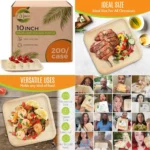 This product offers a value pack of dinnerware, consisting of 4 cases with 50-count of 10-inch square plates each. It’s an ideal choice for various occasions, providing a range of sizes and shapes to suit your needs. The portable nature of these plates makes them perfect for birthday parties, weddings, picnics, camping, and outdoor events. Each plate is crafted from natural leaves, resulting in a unique design and pattern for every piece. This distinctiveness is a standout feature, turning them into a conversation piece at any gathering. Safety is paramount, and these plates are 100% natural, free from toxic chemicals, making them safe for use. As a fully compostable and eco-friendly option, you can dispose of them in your backyard after use. Environmentally conscious, these palm leaf plates are sustainable and do not harm any trees during production. Made from fallen Areca leaves, they are biodegradable and can be recycled or composted within 5-8 weeks. They are 100% natural and chemical-free. These multipurpose dinnerware sets are suitable for house parties, social events, weddings, festivals, takeout food, craftwork, or any time you wish to minimize washing up. The palm dinnerware set is designed to cater to your needs.