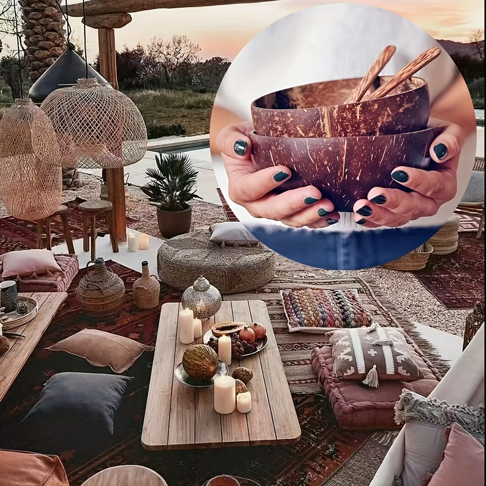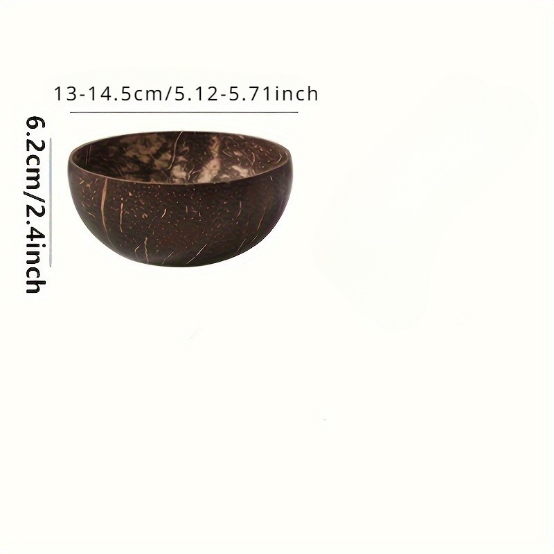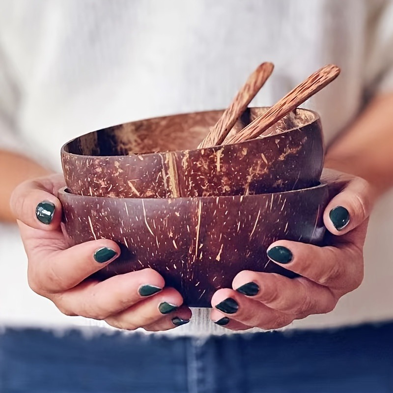 4-Piece Eco-Friendly Natural Coconut Bowls Set with Wooden Spoons - Reusable Handcrafted Salad, Soup, Noodle Serving Bowls - Vegan, Non-Toxic, Heat-Resistant Kitchen Tableware Accessories