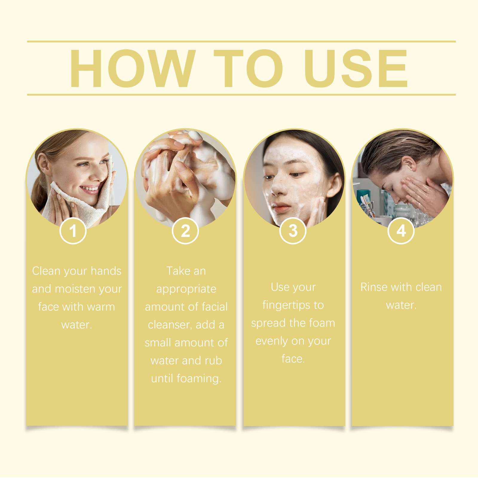 Our Vitamin C Brightening cleanser contains lemon fruit extract and vitamin C. It keeps your skin fresh and bright every day. Its use is simple: clean your hands with warm water and wet your face. Take proper amount of cleanser and rub with a little water until foaming. Use your fingertips to spread the foam evenly over your face. Rinse with water. And can easily remove facial oil stains.