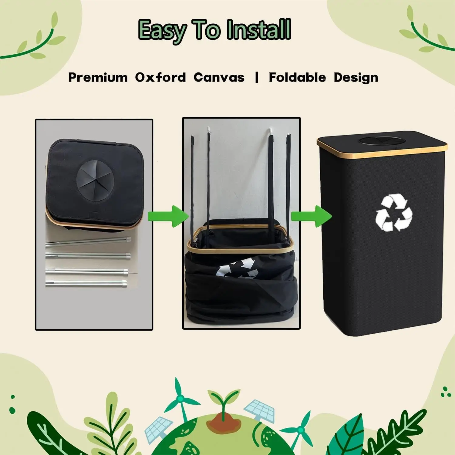 This large-capacity recycling bin is designed to make waste management in your home effortless and eco-friendly. With a spacious 26-gallon size, it can hold up to 35 unsqueezed plastic bottles, providing ample storage for recyclables like cans, glass, and plastic without frequent emptying. The removable lid allows for convenient one-handed operation—simply insert bottles without needing to touch the lid, keeping hands clean and reducing mess. Assembly is quick and straightforward: just insert the four white rods into the black straps at the corners of the base for a stable, collapsible design that saves space when not in use. Made from thickened Oxford cloth with a special waterproof coating, this bin is durable, wear-resistant, and easy to maintain; most stains can be wiped away with a rag without rinsing. The reusable inner bag is crafted from recycled materials, making it 100% environmentally friendly and machine washable for hassle-free cleaning. Secured with horn buckles at all four corners, you can easily detach the bag to transport recyclables directly to collection sites. The lightweight bamboo handle adds portability while resisting rust. Ideal for kitchens or indoor areas, this bin helps organize waste efficiently while promoting sustainable living. Its sturdy construction ensures long-term use, and the sleek black color blends seamlessly with home decor. Upgrade your recycling routine today with this practical and green solution.