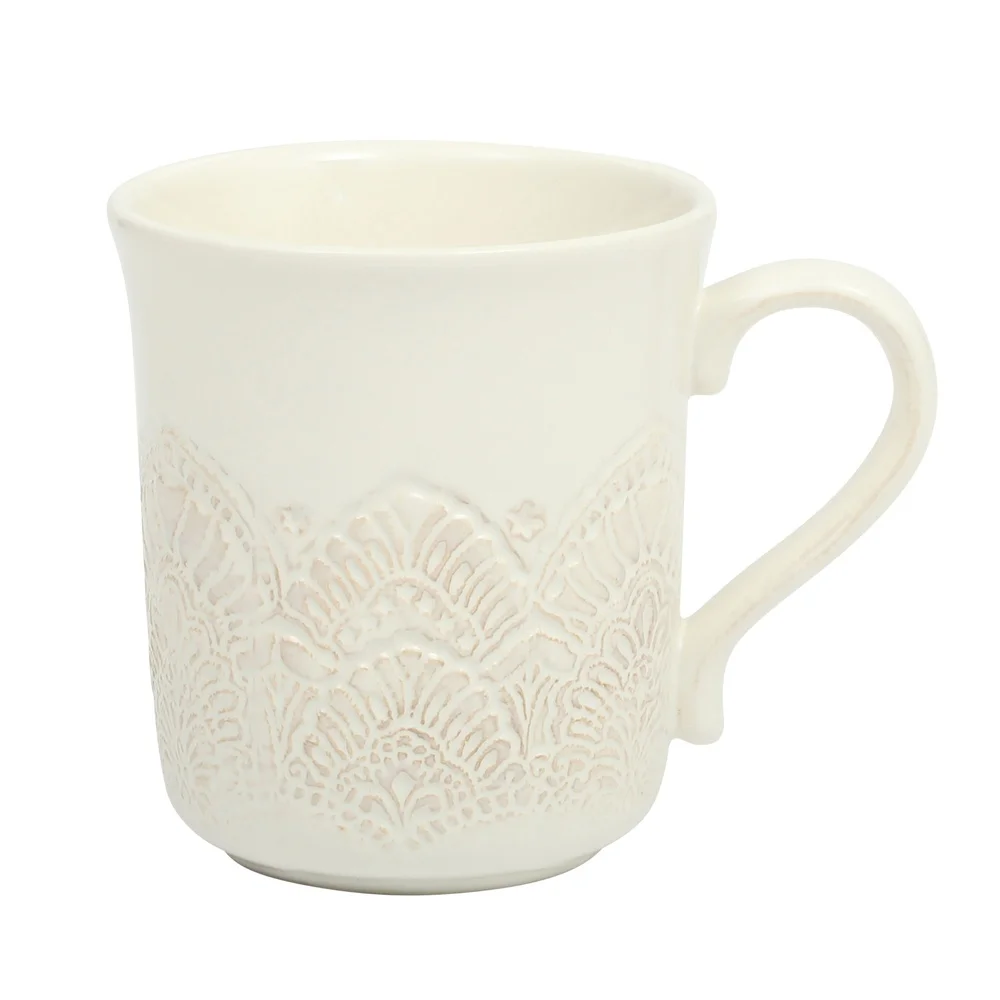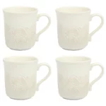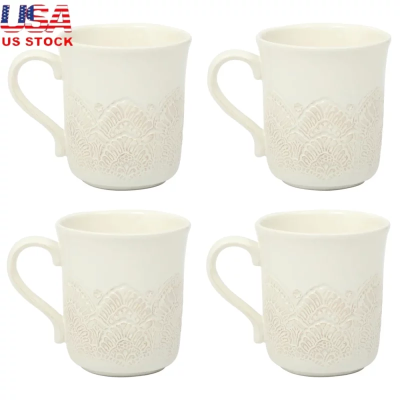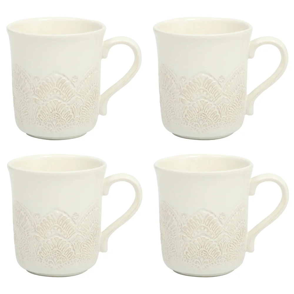Brighten your kitchen with Vintage Lace Ceramic Mug Set in Linen. This four-pack features durable ceramic mugs adorned with intricate embossed lace-inspired details and a soft linen glaze for timeless appeal. Each mug is generously sized, perfect for your favorite coffee, tea, or hot chocolate. Both microwave and dishwasher safe, these mugs offer effortless everyday convenience with vintage-inspired style that fits any occasion.